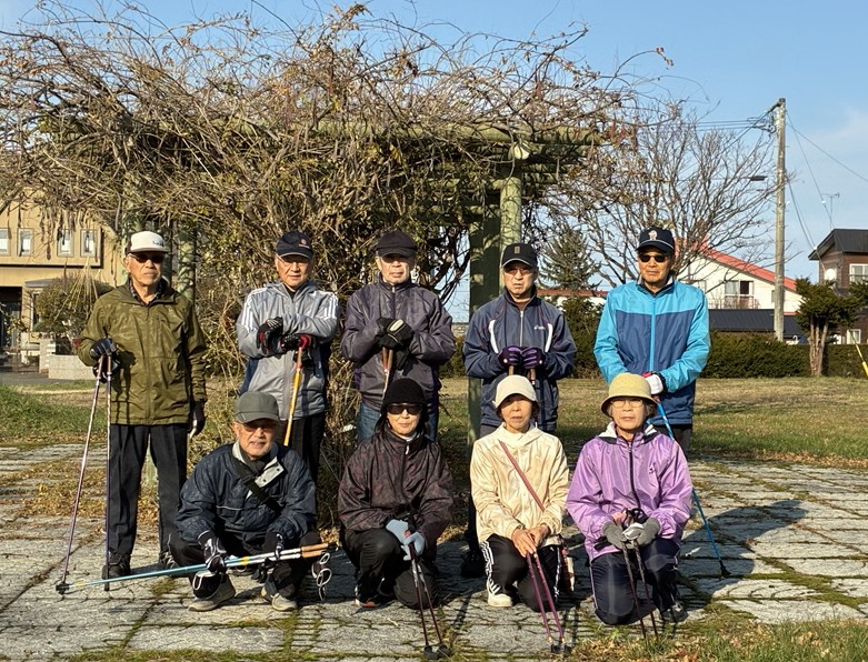 昨日のサンデーノルディックウォーキングです 2025年11月17日 10名の参加でした。 市民センターでレルシアの定期演奏会があり、駐車場、ホールとも満杯で藤棚の前で写真撮影を行いました。 寒からず暑からずこの時期としては最高の天気でした。